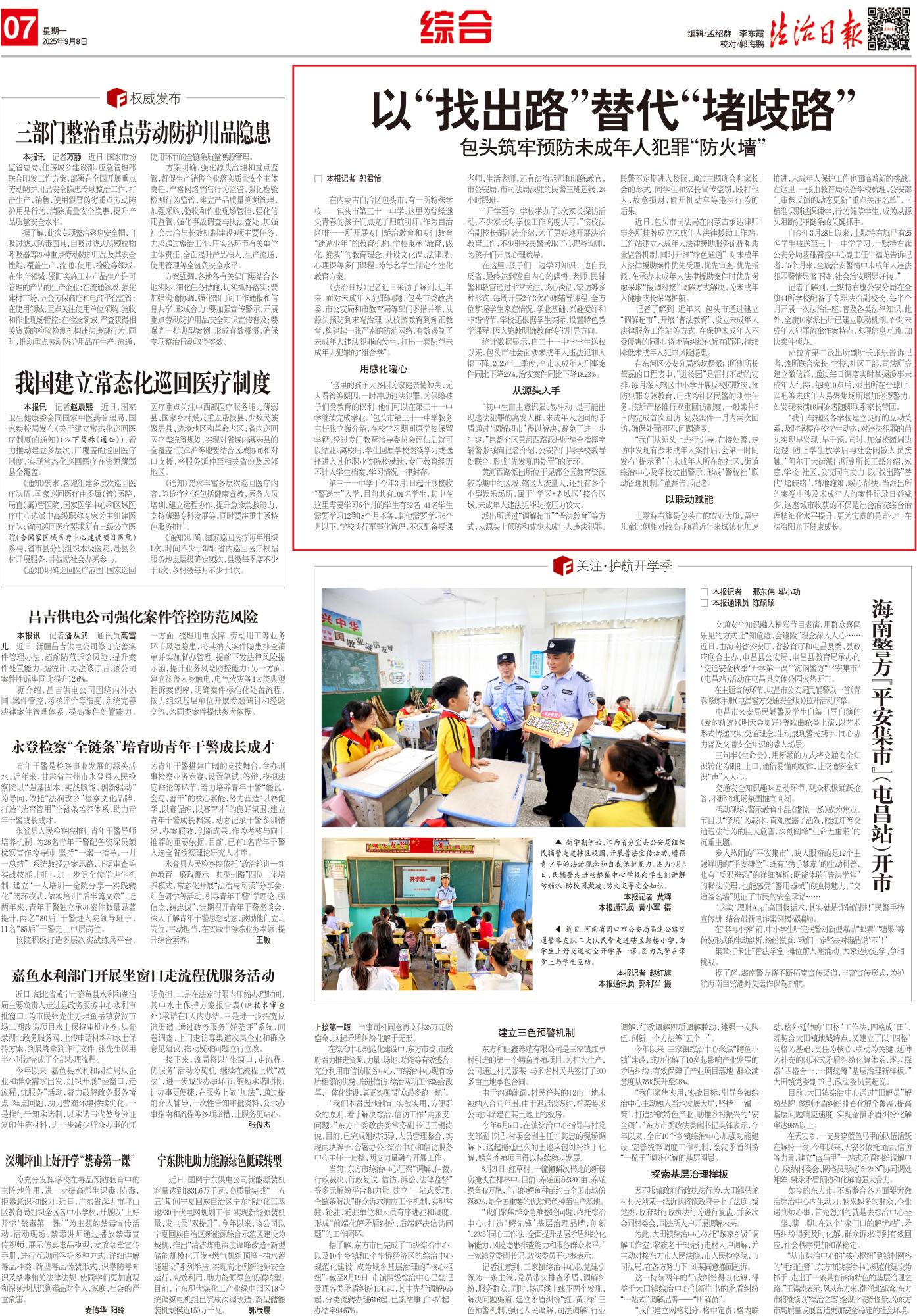 2025年9月8日,《法治日報》第7版整版刊發(fā)題為《以“找出路”替代“堵歧路” 包頭筑牢預(yù)防未成年人犯罪“防火墻”》的文章,報道了近年來,面對未成年人犯罪問題,包頭市委政法委、市公安局和市教育局等部門多措并舉,從源頭預(yù)防到末端治理,從校園教育到矯正教育,構(gòu)建起一張嚴(yán)密的防范網(wǎng)絡(luò),有效遏制了未成年人違法犯罪的發(fā)生,打出一套防范未成年人犯罪的“組合拳”。
