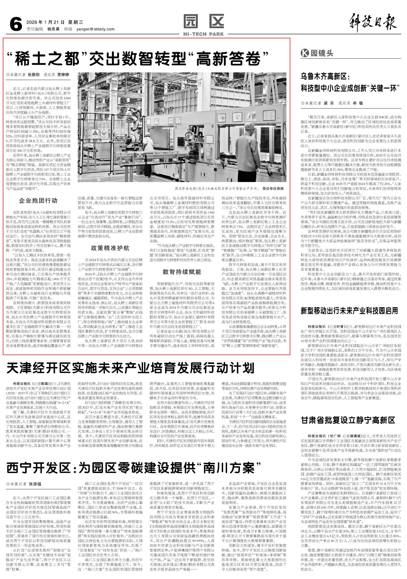 2026年1月21日《科技日報》第6版刊發(fā)了《“稀土之都”交出數(shù)智轉(zhuǎn)型“高新答卷”》的文章,報道了從政策精準滴灌到企業(yè)主動轉(zhuǎn)型,從單個項目突破到全產(chǎn)業(yè)鏈升級,包頭稀土高新區(qū)正以數(shù)字化轉(zhuǎn)型為引擎,推動稀土產(chǎn)業(yè)從“世界級儲量”向“世界級產(chǎn)業(yè)”穩(wěn)步邁進,書寫“稀土之都”數(shù)智轉(zhuǎn)型的“高新答卷”。