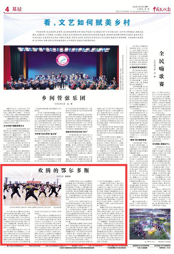 2026年1月26日《中國文化報》第4版刊發(fā)了《歡騰的鄂爾多斯》的文章,報道了廣場舞《歡騰鄂爾多斯》已成為鄉(xiāng)村日?;顒?、節(jié)慶聚會的亮點內(nèi)容,讓群星獎的光芒照亮了基層的舞臺。作品自惠民演出以來,便以濃郁的民族風(fēng)情和強(qiáng)烈的藝術(shù)表現(xiàn)力深受群眾歡迎。