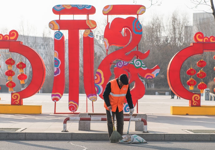 2月5日,正月初一,環(huán)衛(wèi)工人正在清掃街道。春節(jié)期間,呼和浩特市環(huán)衛(wèi)部門在全市特殊區(qū)域、重點路段、公共廁所等公共設施重點部位,加大環(huán)衛(wèi)力量投入,讓節(jié)日里的市容市貌更加亮麗。