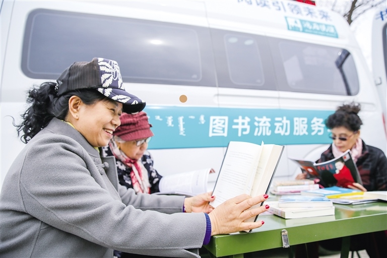 4月10日,首府市民在位于烏蘭夫紀(jì)念館的圖書流動服務(wù)車上借閱圖書。當(dāng)日,呼和浩特市圖書館圖書流動服務(wù)車開啟“公交服務(wù)”模式,第一站駛進(jìn)了烏蘭夫紀(jì)念館。據(jù)了解,圖書流動服務(wù)車裝載各類新書2000余冊,功能齊全,設(shè)施先進(jìn),車內(nèi)裝備自助借還機(jī)、自動化遮陽棚、電視及書架、坐席等,是一座流動的圖書館,方便讀者就近借還圖書。
