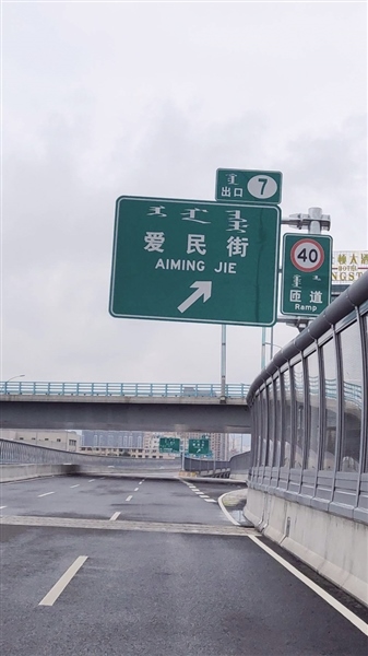 當(dāng)日,記者駕車來到哲里木路高架橋,沿南向北方向行駛,看到沿路提示愛民街下行匝道口的路牌一共有4塊,每塊上都有中文和拼音,顯示為“愛民街”“AIMING JIE”。記者從愛民街下行匝道口到達(dá)愛民街與哲里木路輔路交會(huì)處,在東西方向的愛民街路口發(fā)現(xiàn)路牌名是由中文、蒙古文和拼音組成,其中拼音為“AIMIN JIE”。因呼市地區(qū)方言中,“MING”與“MIN”的發(fā)音不易分辨,這也是為什么網(wǎng)友在視頻中說用方言命名路名的原因。