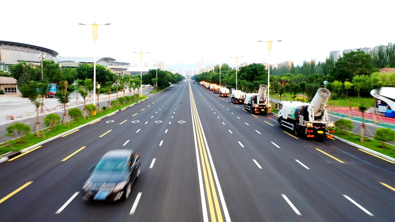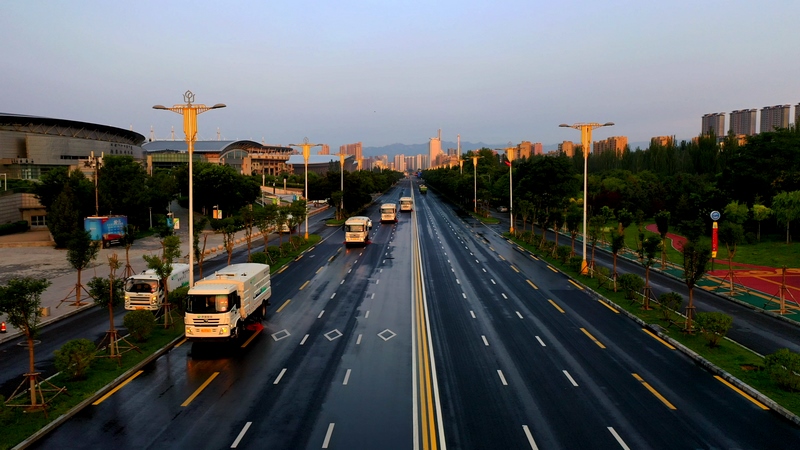 當東方微微發(fā)白,高壓沖洗車強力開路,將道路上的廢棄物、積灰沖到道路兩側(cè)。