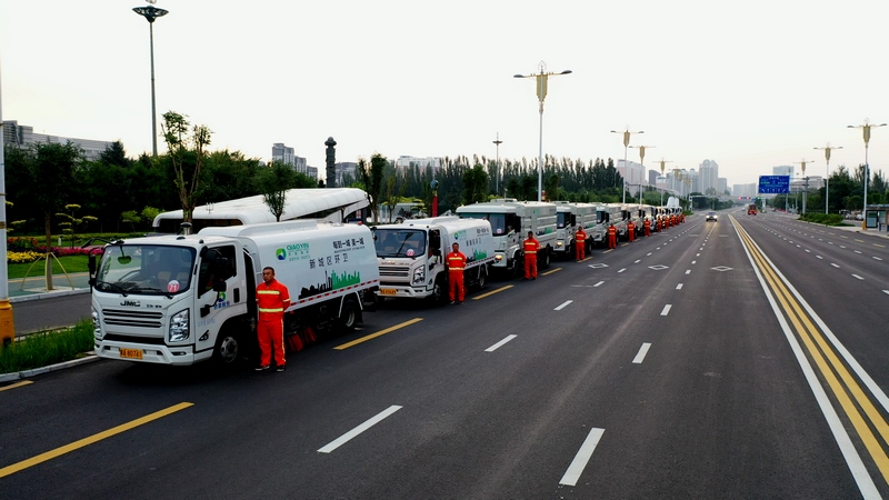 隨后,被譽為“大馬蜂”和“小蜜蜂”的18噸洗掃車和8噸洗掃車分工合作,將寬闊的成吉思汗大街機動車道和非機動車道清掃得干干凈凈。