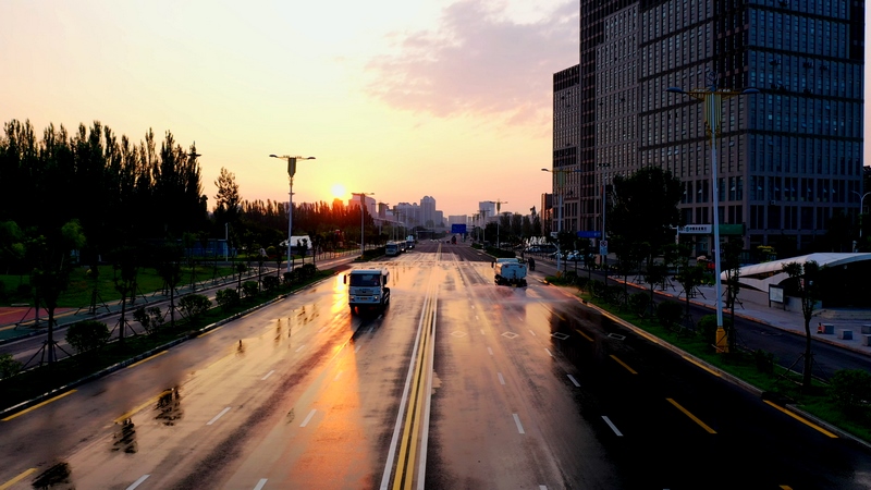 6:30,當一輪紅日升起的時候,作業(yè)結(jié)束,一個干凈整潔、空氣清新的城市呈現(xiàn)在市民面前。