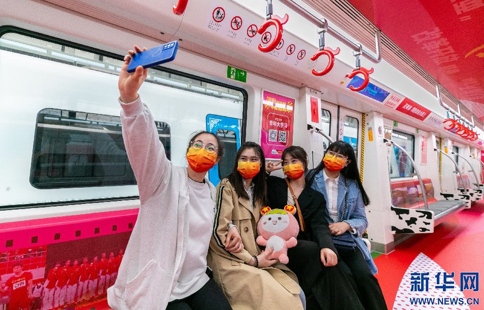 5月3日,呼和浩特市民在“青春快線”主題列車上留影。新華網(wǎng)發(fā)(丁根厚攝)