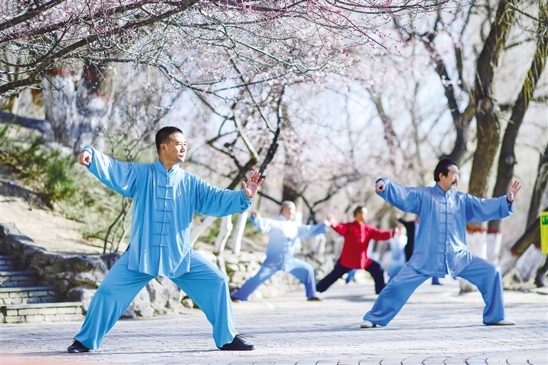 桃花樹下練太極 4月4日,健身愛好者在呼和浩特市滿都海公園的桃花樹下......