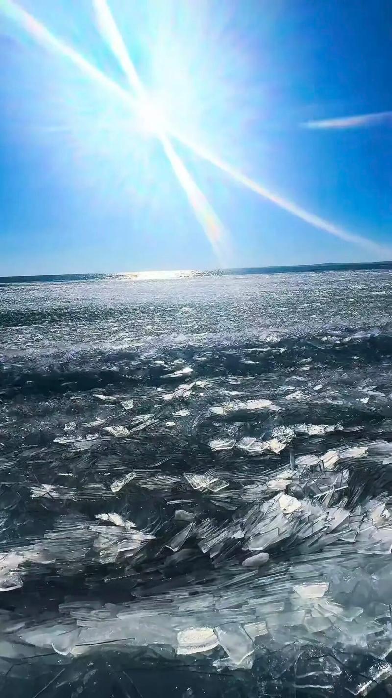 在呼倫湖西岸觀景臺,湖岸線已被層層疊疊的冰排環(huán)繞,這些不規(guī)則的冰體有的如臥虎盤踞,有的似玉柱擎天,最高可達三四米,宛如一道天然冰障。正午陽光灑落,冰層折射出晶瑩的光澤,偶有寒風掠過,冰排碰撞發(fā)出沉悶的聲響,在空曠的湖畔回蕩?!斑@些冰塊都是風浪推著往岸邊堆的,每天形狀都不一樣?!背D犟v守保護區(qū)的監(jiān)測員指著湖面介紹,封凍初期的風浪是塑造冰排的關(guān)鍵,無風浪時,封凍的湖面光滑如鏡,而有風天氣則會讓冰層碎裂堆疊,形成獨特的冰排景觀。