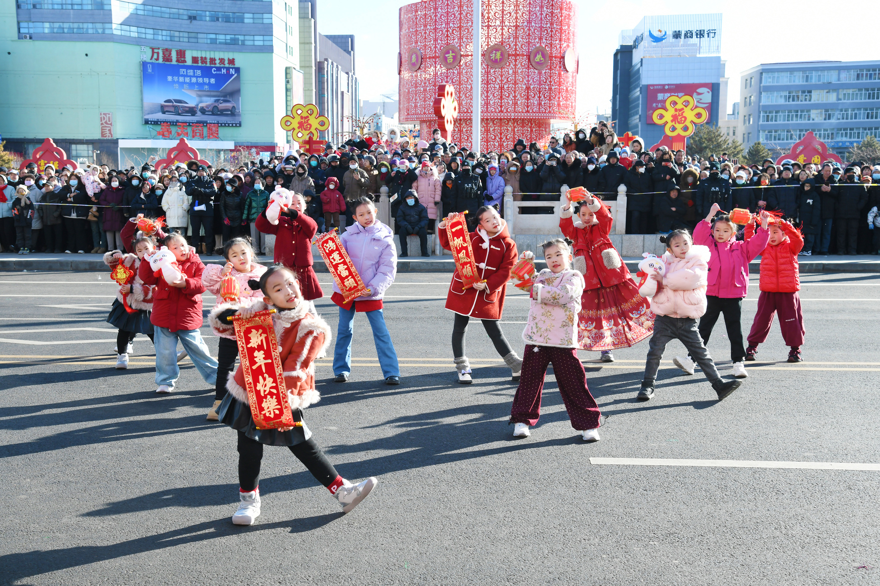 一群萌娃身著喜慶冬裝活力起舞。