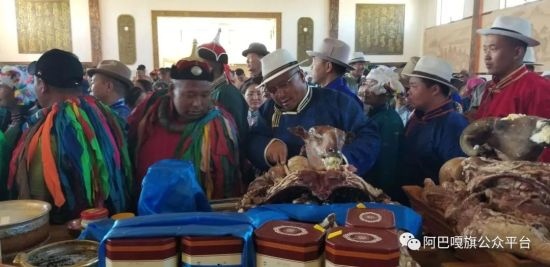 早上八點(diǎn)整,別力古臺(tái)祭祀以傳統(tǒng)的蒙古族祭祀儀軌進(jìn)行。上千民眾身著盛裝,從旅游度假區(qū)的正門(mén)排成數(shù)列長(zhǎng)隊(duì),每支隊(duì)伍最前面的代表托舉著盛有“術(shù)思”(整羊)的大木盤(pán),依次步入祭祀宮。祭祀活動(dòng)正式開(kāi)始,信眾們紛紛獻(xiàn)上手中的貢品和哈達(dá),他們神情莊重,十分虔誠(chéng)的向別力古臺(tái)頂禮膜拜,祈禱草原風(fēng)調(diào)雨順,五畜興旺。