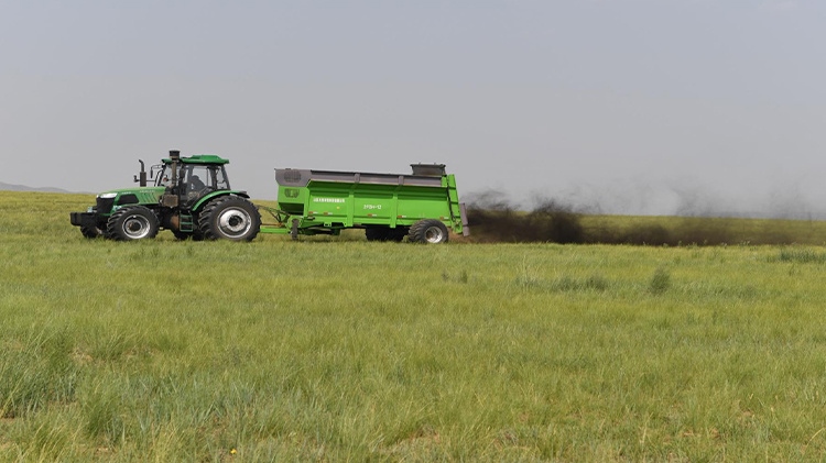 在退化放牧場(chǎng)治理區(qū),施工人員用推土機(jī)推平坑洼不平的風(fēng)蝕坑、整理?xiàng)壨炼眩话凑諊姺鶎?~8米的行距,用拋肥機(jī)將牛羊固態(tài)糞肥和含有氮、磷、鉀等生物有機(jī)液態(tài)肥拋灑在草場(chǎng)上,增加土壤肥力;用切根機(jī)將稀疏的羊草切開、促進(jìn)分蘗繁殖、復(fù)壯,增加種群密度;采用栽設(shè)4×4米網(wǎng)格狀沙幛、覆蓋草簾來降溫保墑抗旱保苗,與此同時(shí)與項(xiàng)目區(qū)牧戶簽訂三年的禁牧、生態(tài)補(bǔ)償、管護(hù)協(xié)議。