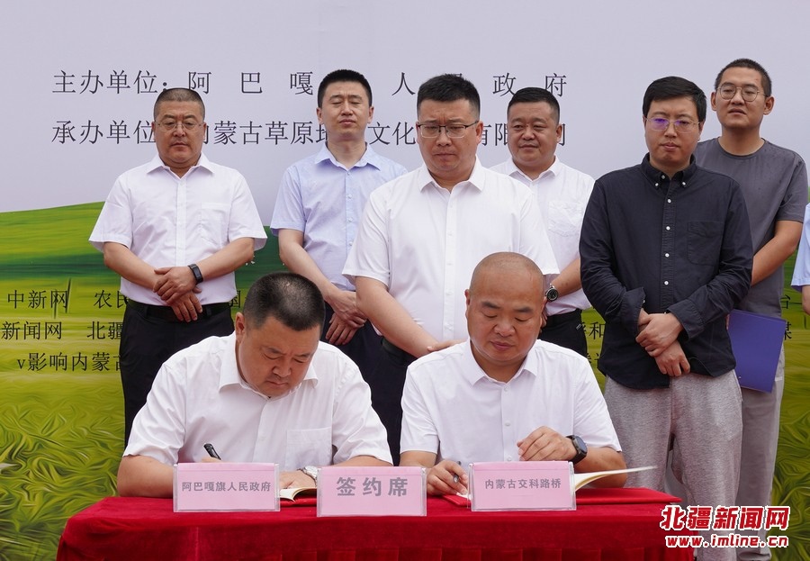 推介會現(xiàn)場,阿巴嘎旗人民政府副旗長李軍分別與內(nèi)蒙古交科路橋建設(shè)有限公司黨委書記、董事長鈕英才,內(nèi)蒙古草原地圖文化傳播有限公司負(fù)責(zé)人王國柱簽訂戰(zhàn)略合作協(xié)議。
