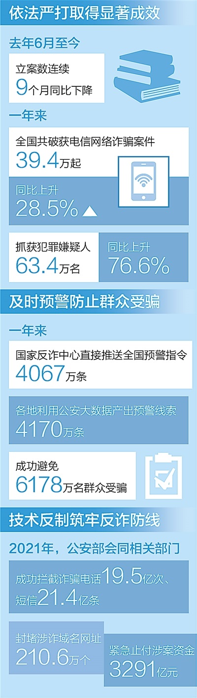據(jù)介紹,全國公安機(jī)關(guān)深入開展“云劍”“長城”“斷卡”“斷流”“5·10”等專項(xiàng)行動(dòng),先后組織開展150次全國集群戰(zhàn)役。一年來,共破獲電信網(wǎng)絡(luò)詐騙案件39.4萬起,抓獲犯罪嫌疑人63.4萬名,同比分別上升28.5%和76.6%。根據(jù)最新統(tǒng)計(jì),電信網(wǎng)絡(luò)詐騙立案數(shù)連續(xù)9個(gè)月同比下降,打擊治理工作取得顯著成效。