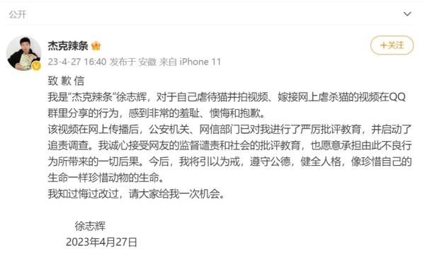 27日16時(shí)40分,@杰克辣條 在微博發(fā)表了署名“徐志輝”的致歉信稱,對于自己虐待貓并拍視頻、嫁接網(wǎng)上虐殺貓的視頻在QQ群里分享的行為,感到非常的羞恥、懊悔和抱歉。該視頻在網(wǎng)上傳播后,公安機(jī)關(guān)、網(wǎng)信部門已對其進(jìn)行了嚴(yán)厲批評教育,并啟動了追責(zé)調(diào)查。