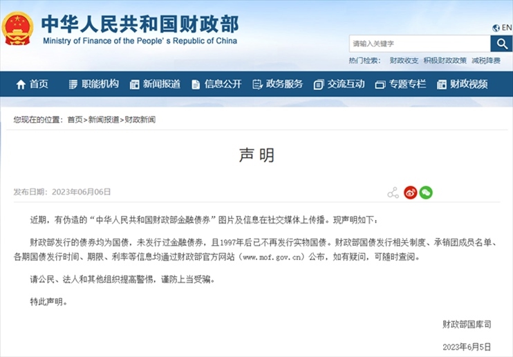 ·財(cái)政部發(fā)布聲明:發(fā)行的債券均為國(guó)債,未發(fā)行過(guò)金融債券。