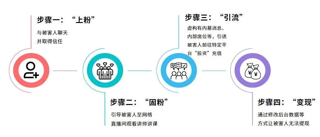 接下來,講師會通過虛構(gòu)有內(nèi)幕消息、內(nèi)部席位等情節(jié),將被害人“引流”至團(tuán)伙自制的“長盛資本”“瑞達(dá)資產(chǎn)”“匯利資產(chǎn)”等平臺“投資”充值,后把握時機(jī),通過修改后臺數(shù)據(jù)等方式讓被害人無法提現(xiàn),卻成為他們的“變現(xiàn)”時刻。至案發(fā)時,該團(tuán)伙已詐騙多名被害人,犯罪金額共計人民幣500余萬元。
