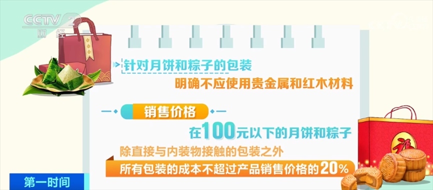 針對(duì)月餅和粽子的包裝,明確不應(yīng)使用貴金屬和紅木材料;銷售價(jià)格在100元以下的月餅和粽子,除直接與內(nèi)裝物接觸的包裝之外,所有包裝的成本不超過產(chǎn)品銷售價(jià)格的20%;售價(jià)在100元以上的,包裝成本不超過產(chǎn)品銷售價(jià)格的15%。