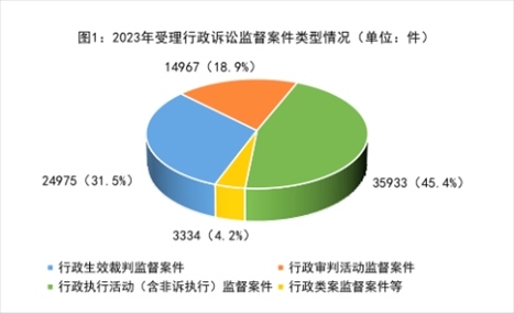 1.行政檢察監(jiān)督職能全面發(fā)展。一方面,訴訟內(nèi)監(jiān)督進一步強化。2023年全國檢察機關(guān)共受理行政訴訟監(jiān)督案件79209件,其中,行政生效裁判監(jiān)督案件24975件,占比31.5%;行政審判活動監(jiān)督案件14967件,占比18.9%;行政執(zhí)行活動(含非訴執(zhí)行)監(jiān)督案件35933件,占比45.4%;行政類案監(jiān)督等案件3334件,占比4.2%。另一方面,“訴訟外”監(jiān)督實現(xiàn)新突破。2023年辦理行刑反向銜接案件中對被不起訴人應受行政處罰的提出檢察意見11.3萬人,辦理行政違法行為監(jiān)督案件提出檢察建議3.2萬件。行政檢察各項職能發(fā)展更加全面、更加協(xié)調(diào)。針對行政訴訟、行政執(zhí)法和執(zhí)行活動存在的問題,以抗訴、檢察建議等方式提出監(jiān)督意見17.4萬件。