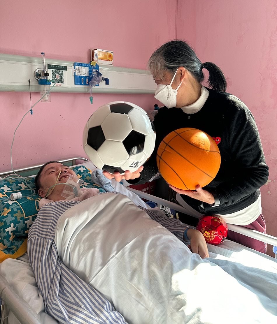 張昌碩恢復(fù)微小意識(shí)后,鄭建英從家里帶了兩顆昌碩最喜歡的足球到病床前,一大一小。每次,她舉起一顆足球放到他眼前,問他:“哪只是曼聯(lián)的?”昌碩的視線會(huì)左右移動(dòng),選擇正確的那一顆。
