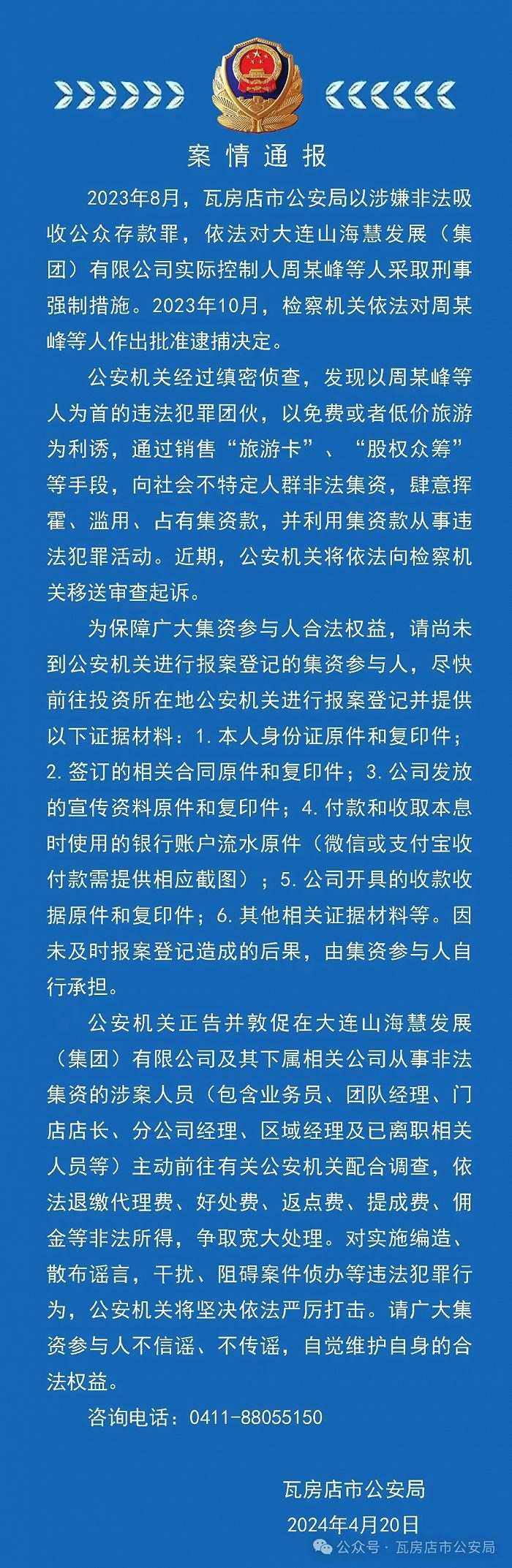 央視網(wǎng)消息:據(jù)瓦房店市公安局官微消息,遼寧瓦房店市公安局通報,2023年8月,瓦房店市公安局以涉嫌非法吸收公眾存款罪,依法對大連山?;郯l(fā)展(集團)有限公司實際控制人周某峰等人采取刑事強制措施。2023年10月,檢察機關(guān)依法對周某峰等人作出批準逮捕決定。公安機關(guān)經(jīng)過縝密偵查,發(fā)現(xiàn)以周某峰等人為首的違法犯罪團伙,以免費或者低價旅游為利誘,通過銷售“旅游卡”、“股權(quán)眾籌”等手段,向社會不特定人群非法集資,肆意揮霍、濫用、占有集資款,并利用集資款從事違法犯罪活動。近期,公安機關(guān)將依法向檢察機關(guān)移送審查起訴。