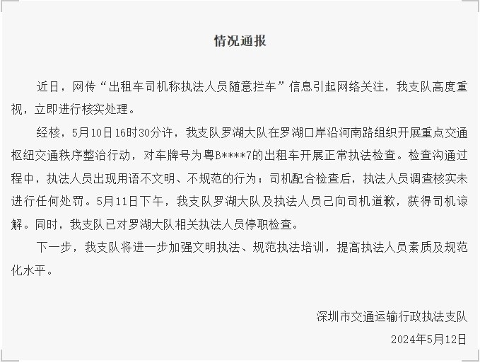 經(jīng)核,5月10日16時30分許,深圳市交通運輸行政執(zhí)法支隊羅湖大隊在羅湖口岸沿河南路組織開展重點交通樞紐交通秩序整治行動,對車牌號為粵B****7的出租車開展正常執(zhí)法檢查。檢查溝通過程中,執(zhí)法人員出現(xiàn)用語不文明、不規(guī)范的行為;司機配合檢查后,執(zhí)法人員調(diào)查核實未進行任何處罰。5月11日下午,深圳市交通運輸行政執(zhí)法支隊羅湖大隊及執(zhí)法人員己向司機道歉,獲得司機諒解。同時,深圳市交通運輸行政執(zhí)法支隊已對羅湖大隊相關(guān)執(zhí)法人員停職檢查。