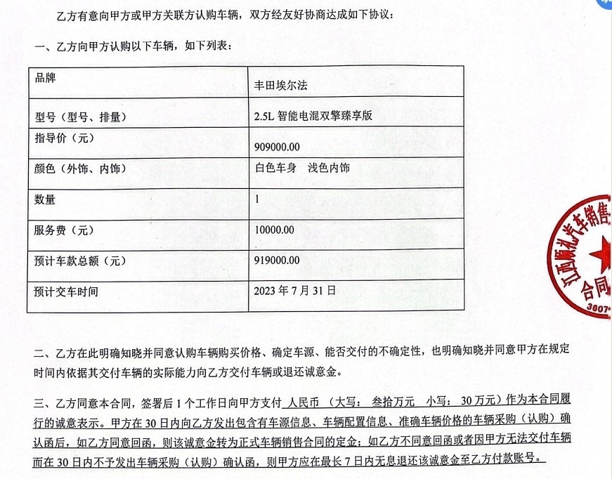 豐田埃爾法汽車,預(yù)計車款總額91.9萬元,其中車輛指導(dǎo)價90.9萬元,服務(wù)費1萬元,預(yù)計交車時間為2023年7月31日。簽訂認購合同當天,任先生支付了30萬元誠意金。