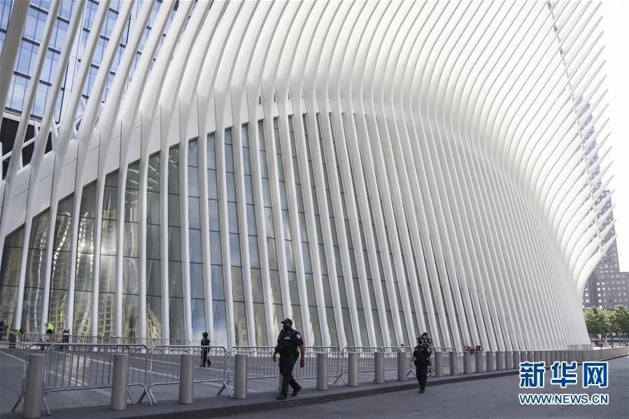 6月10日,警察在美國(guó)紐約世貿(mào)中心車站外戴著口罩巡邏。新華社記者王迎攝