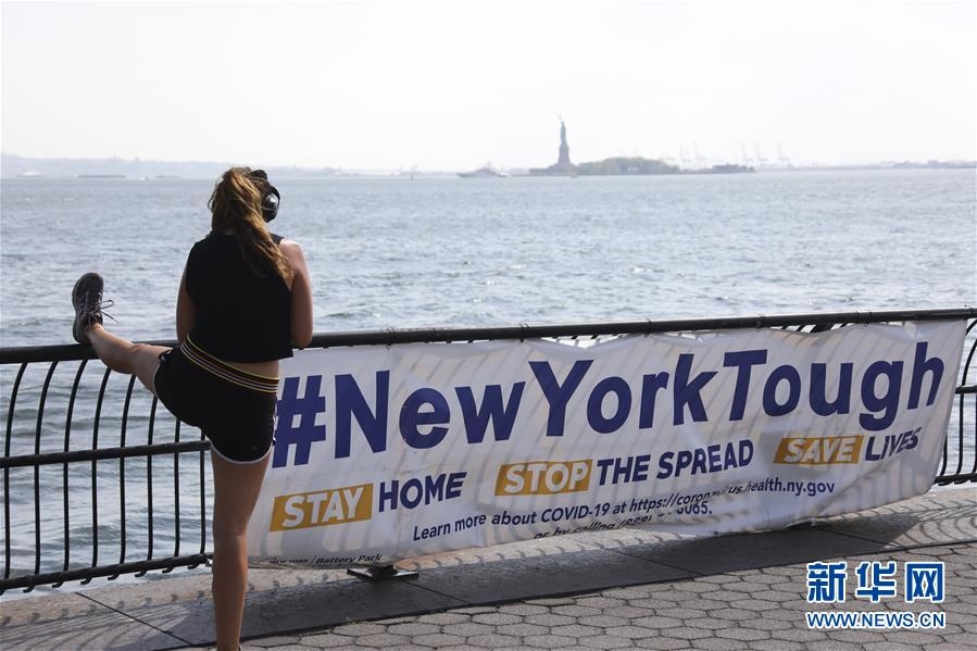 6月10日,一名女子在美國(guó)紐約一處公園內(nèi)寫有“紐約堅(jiān)強(qiáng)”的橫幅旁鍛煉。新華社記者王迎攝