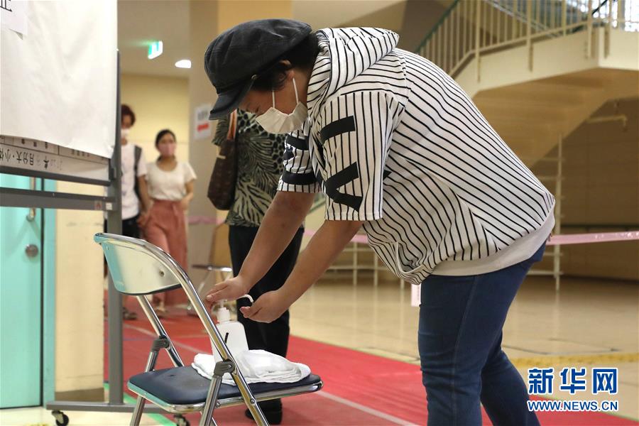 7月5日,選民在日本東京的一個(gè)投票點(diǎn)入口使用消毒液。日本東京都知事選舉于5日舉行投票。新華社記者杜瀟逸攝