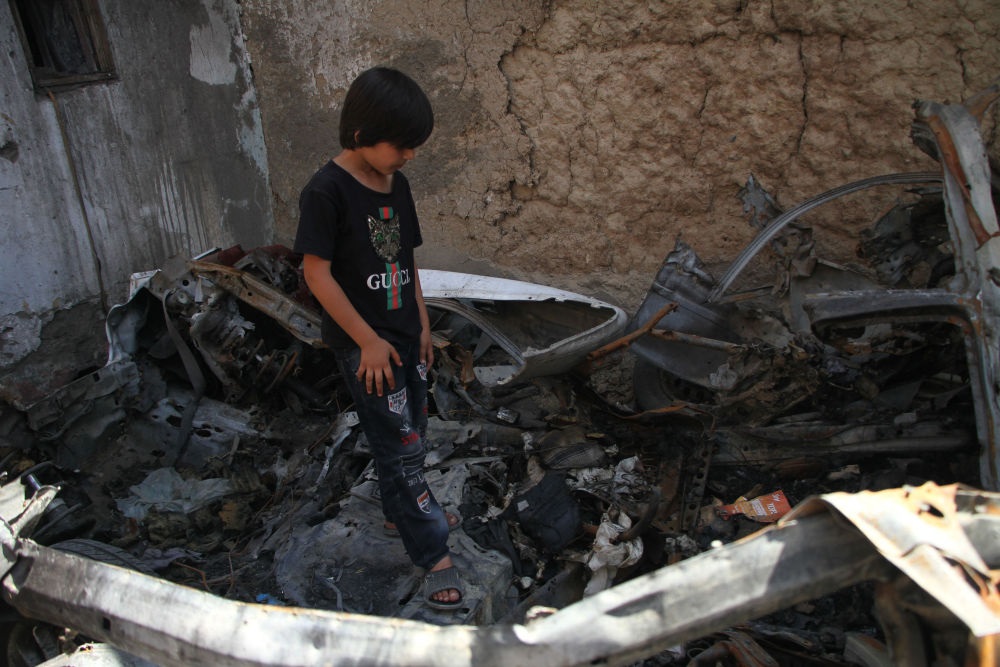 9月18日,在8月29日被美軍無(wú)人機(jī)襲擊的阿富汗喀布爾居民區(qū),遇難者親人站在汽車(chē)殘骸上。新華社發(fā)(塞夫拉赫曼·薩菲攝)