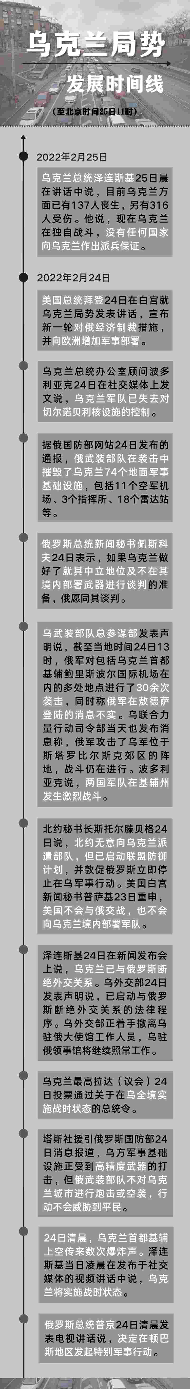 新華社北京2月25日電 自俄羅斯軍隊(duì)24日晨在頓巴斯地區(qū)發(fā)起特別軍事行動(dòng)以來,俄軍對(duì)多處地點(diǎn)進(jìn)行了襲擊。俄方表示,如烏克蘭做好就其中立地位及不在其境內(nèi)部署武器進(jìn)行談判的準(zhǔn)備,俄愿同其談判。以下為截至目前的重要節(jié)點(diǎn)時(shí)間線: