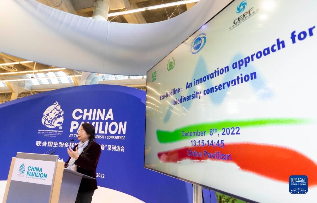 12月8日,在加拿大蒙特利爾舉行的《生物多樣性公約》第十五次締約方大會(COP15)第二階段會議上,中國角開展的一場邊會活動聚焦生態(tài)保護(hù)紅線。 新華社發(fā)(鄒崢攝)