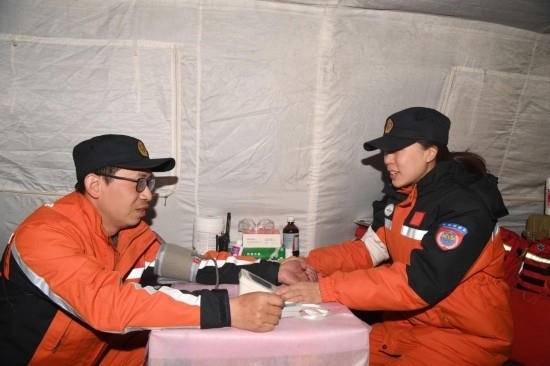 2月13日,在位于土耳其哈塔伊省哈塔伊體育館外的中國救援隊營地,醫(yī)生為救援隊成員檢查身體。