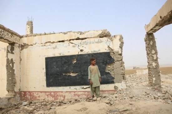 2022年8月23日,在阿富汗南部赫爾曼德省桑金地區(qū),一名男孩站在廢墟之中。桑金地區(qū)曾經(jīng)最繁華的市場,如今遍布美軍空襲留下的一個個巨大彈坑。