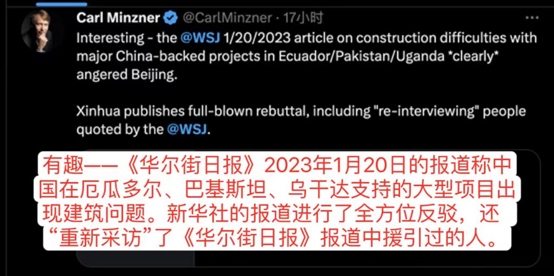 美國福特漢姆大學(xué)教授、美國外交關(guān)系協(xié)會中國問題高級研究員明克勝轉(zhuǎn)發(fā)了新華社的報道,并稱:有趣——《華爾街日報》2023年1月20日的報道稱中國在厄瓜多爾、巴基斯坦、烏干達(dá)支持的大型項(xiàng)目出現(xiàn)建筑問題。新華社的報道進(jìn)行了全方位反駁,還“重新采訪”了《華爾街日報》報道中援引過的人。