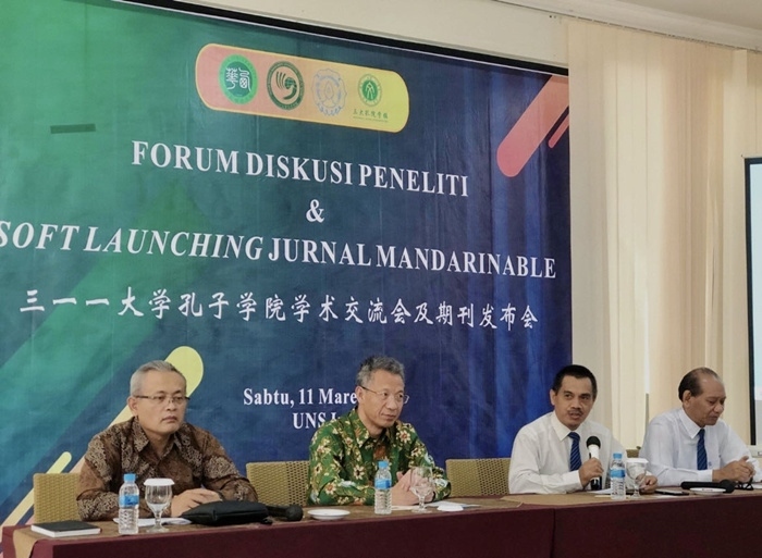 人民網(wǎng)雅加達3月12日電 (記者張杰)11日下午,三一一大學(xué)孔子學(xué)院學(xué)術(shù)期刊《Mandarianable》發(fā)布會及四周年生日會在梭羅隆重舉行。西華大學(xué)校長劉樹根、三一一大學(xué)學(xué)術(shù)事務(wù)副校長(尤努斯)Mr.Yunus教授、研究與創(chuàng)新副校長(坤卓落)Mr.Kuncoro教授、合作與信息副校長(夏啟丹)Mr. Sajidan教授、成都市政府代表潘文吉、張友東、羅會成、三一一大學(xué)部分院系代表等嘉賓出席了本次發(fā)布會。