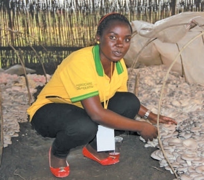 盧旺達國立大學的學生姍臺在菇棚中采收平菇。 中國國家菌草工程技術研究中心供圖