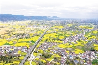 | 陜西省漢中市南鄭區(qū)岳家?guī)X村,一列動車組列車在金燦燦的油菜花海中穿行。 曹 欣攝(人民視覺) |