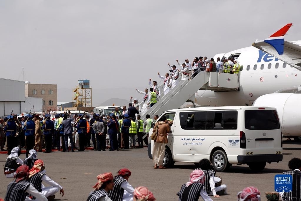 4月15日,在也門薩那機(jī)場(chǎng),獲釋胡塞武裝戰(zhàn)俘走下飛機(jī)。