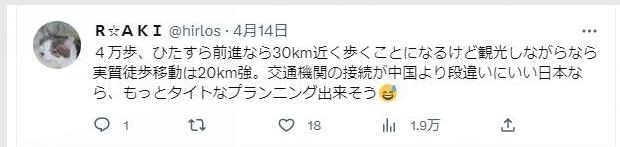 “4萬步,直線距離相當(dāng)于將近30公里,不過如果是徒步邊走邊逛景點,差不多是20來公里。如果在公共交通更便利的日本,應(yīng)該能壓縮出一個更緊湊的行程?!?/p>