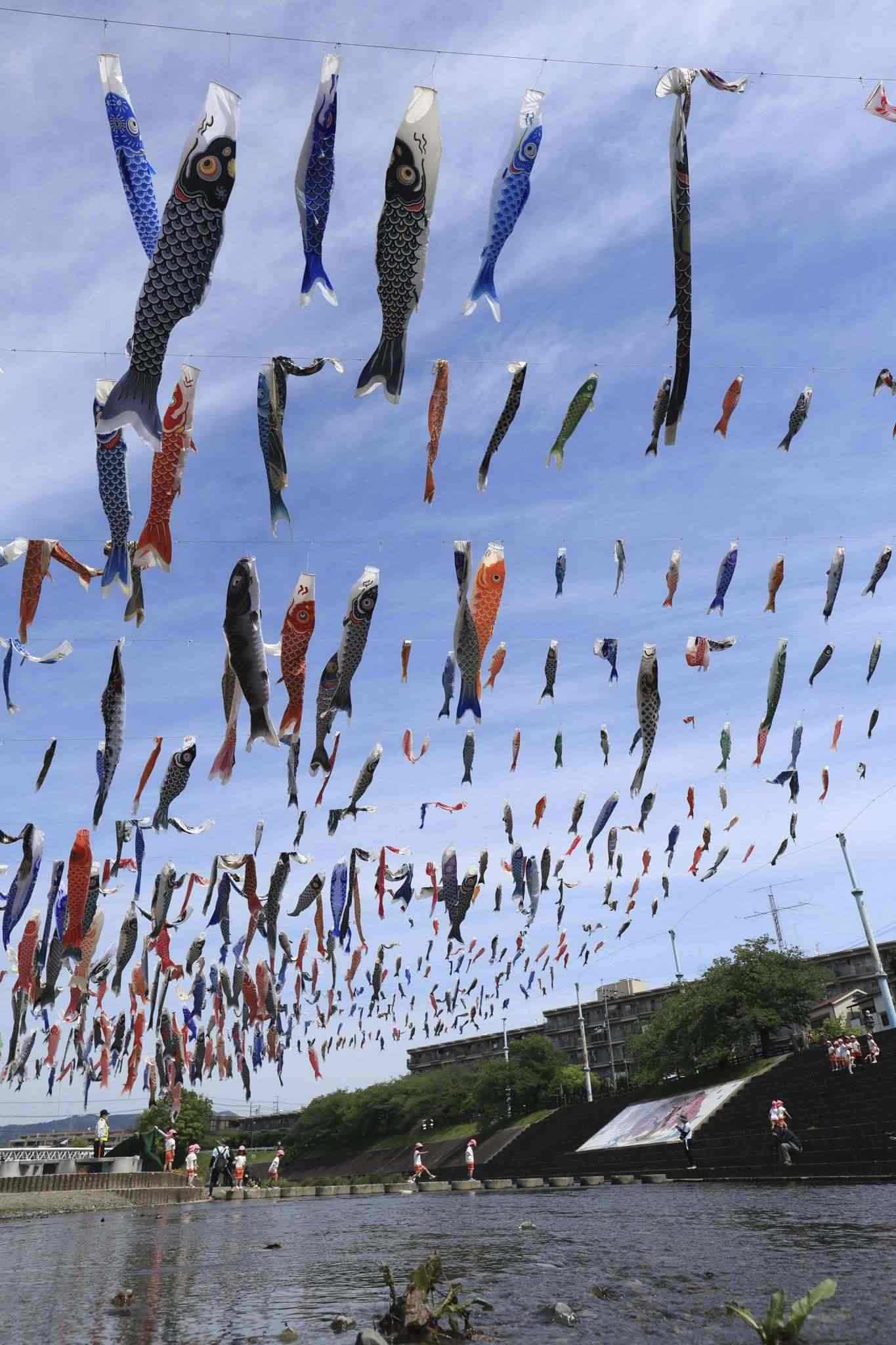 當(dāng)?shù)貢r(shí)間2023年4月28日,日本大阪,大約1000條鯉魚旗在高摫市的秋田川河上空飄揚(yáng),慶祝5月5日兒童節(jié)。視覺中國