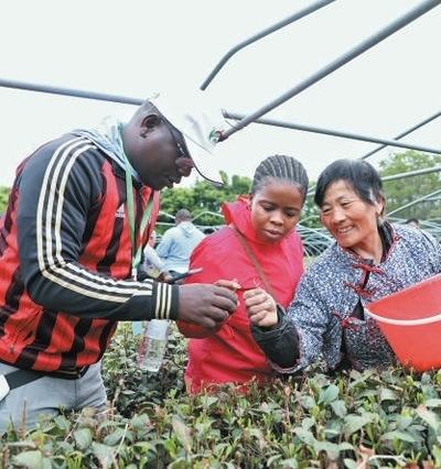 4月21日,在山東泰安道朗鎮(zhèn),非洲青年代表向茶農(nóng)學(xué)習(xí)采摘知識。本報記者 陳尚文攝