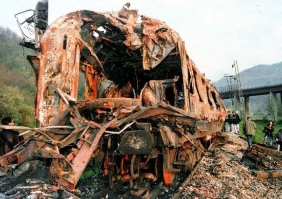 1999年3月24日,以美國(guó)為首的北約向南斯拉夫聯(lián)盟開(kāi)始發(fā)動(dòng)大規(guī)模空襲,武力干涉科索沃危機(jī)。資料照片顯示被北約飛機(jī)炸毀的火車(chē)。新華社發(fā)