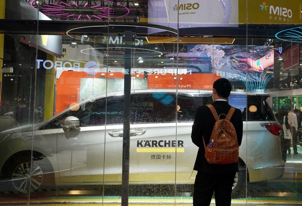 2021年11月6日,觀眾在第四屆進(jìn)博會(huì)德國(guó)卡赫展臺(tái)參觀全自動(dòng)洗車機(jī)器人的演示。(新華社記者劉穎攝)