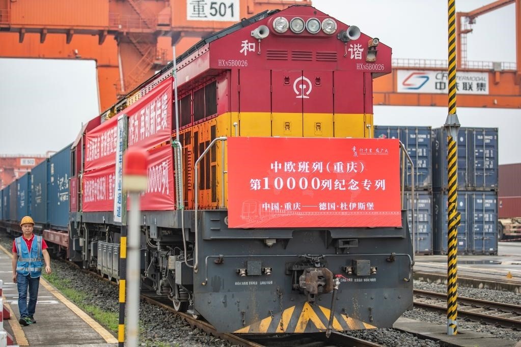 2022年6月23日,在重慶團(tuán)結(jié)村中心站,鐵路工作人員從中歐班列(重慶)第10000列列車旁走過(guò)。當(dāng)日,第10000列中歐班列(重慶)從重慶團(tuán)結(jié)村中心站順利駛出,奔赴德國(guó)杜伊斯堡。(新華社記者黃偉攝)