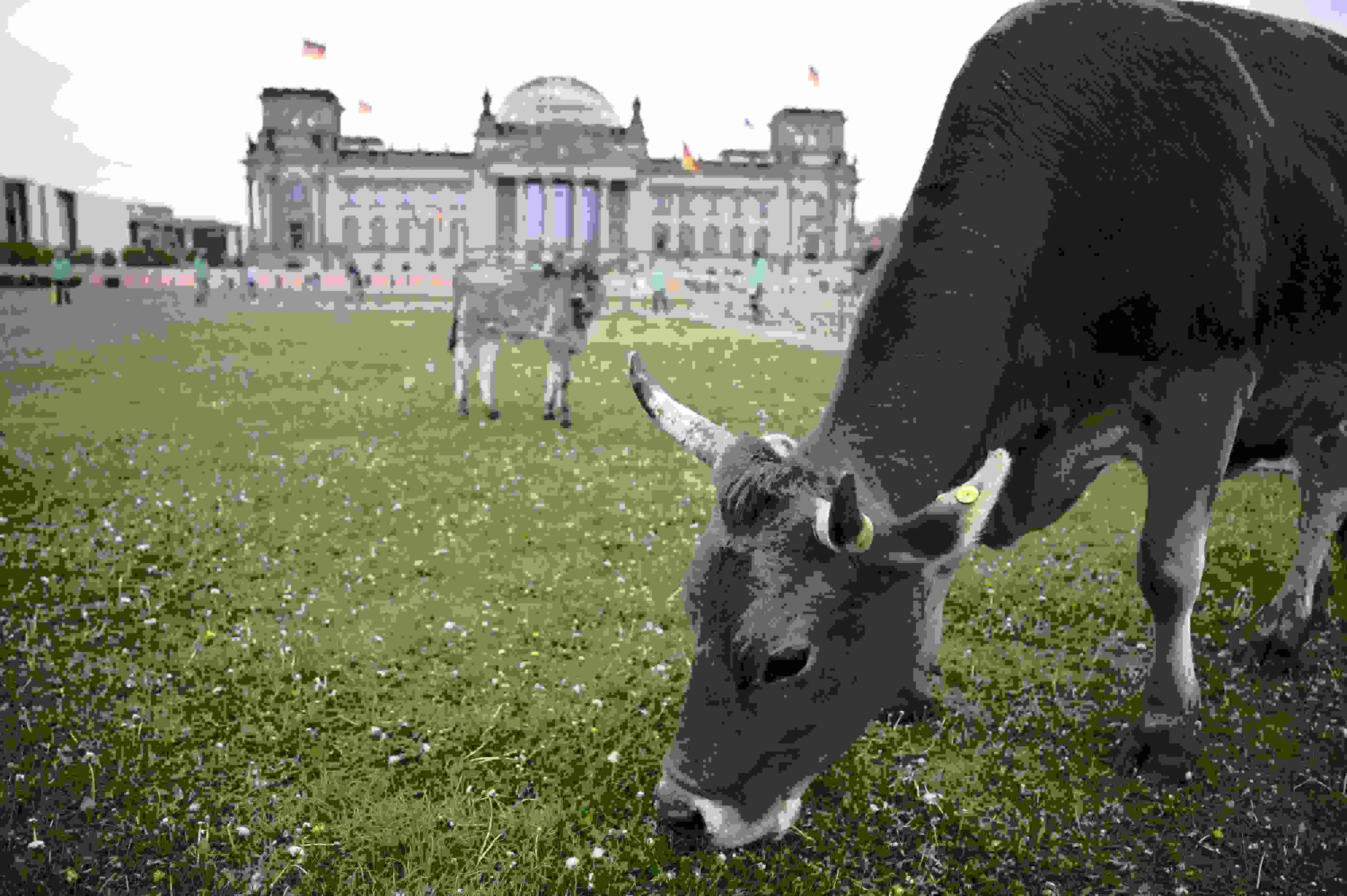 當(dāng)?shù)貢r間2023年5月16日,德國柏林,牛群被驅(qū)趕到國會大廈前吃草?;顒咏M織者希望通過這一行動,呼吁政治家們采取更多措施來促進(jìn)牧場農(nóng)業(yè)。 視覺中國