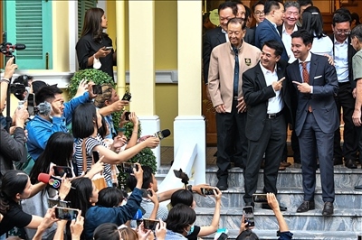 當(dāng)?shù)貢r間2023年5月17日,泰國曼谷,泰國遠(yuǎn)進(jìn)黨黨魁皮塔與泰國為泰黨黨魁春拉南在與聯(lián)盟伙伴舉行會議后合影。