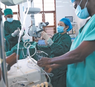 第三十二期中國援坦桑尼亞桑給巴爾醫(yī)療隊(duì)的眼科醫(yī)生與當(dāng)?shù)蒯t(yī)生一起做術(shù)前準(zhǔn)備。 新華社記者 董江輝攝