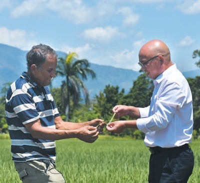 中國農(nóng)業(yè)專家(右)和當(dāng)?shù)貙<以诙嗝啄峒訃宜九嘤?xùn)中心討論水稻種植問題。 新華社記者 朱婉君攝