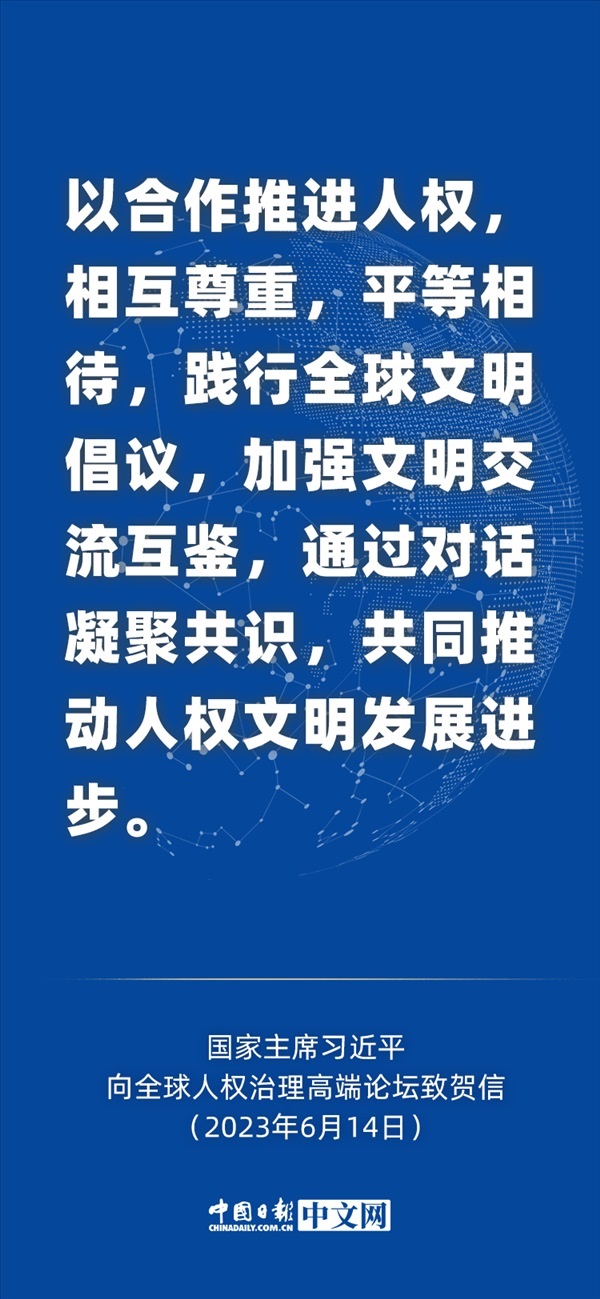 6月14日,國(guó)家主席習(xí)近平向全球人權(quán)治理高端論壇致賀信。習(xí)近平指出,當(dāng)前,人類又一次站在歷史的十字路口,全球人權(quán)治理面臨嚴(yán)峻挑戰(zhàn)。我們主張: